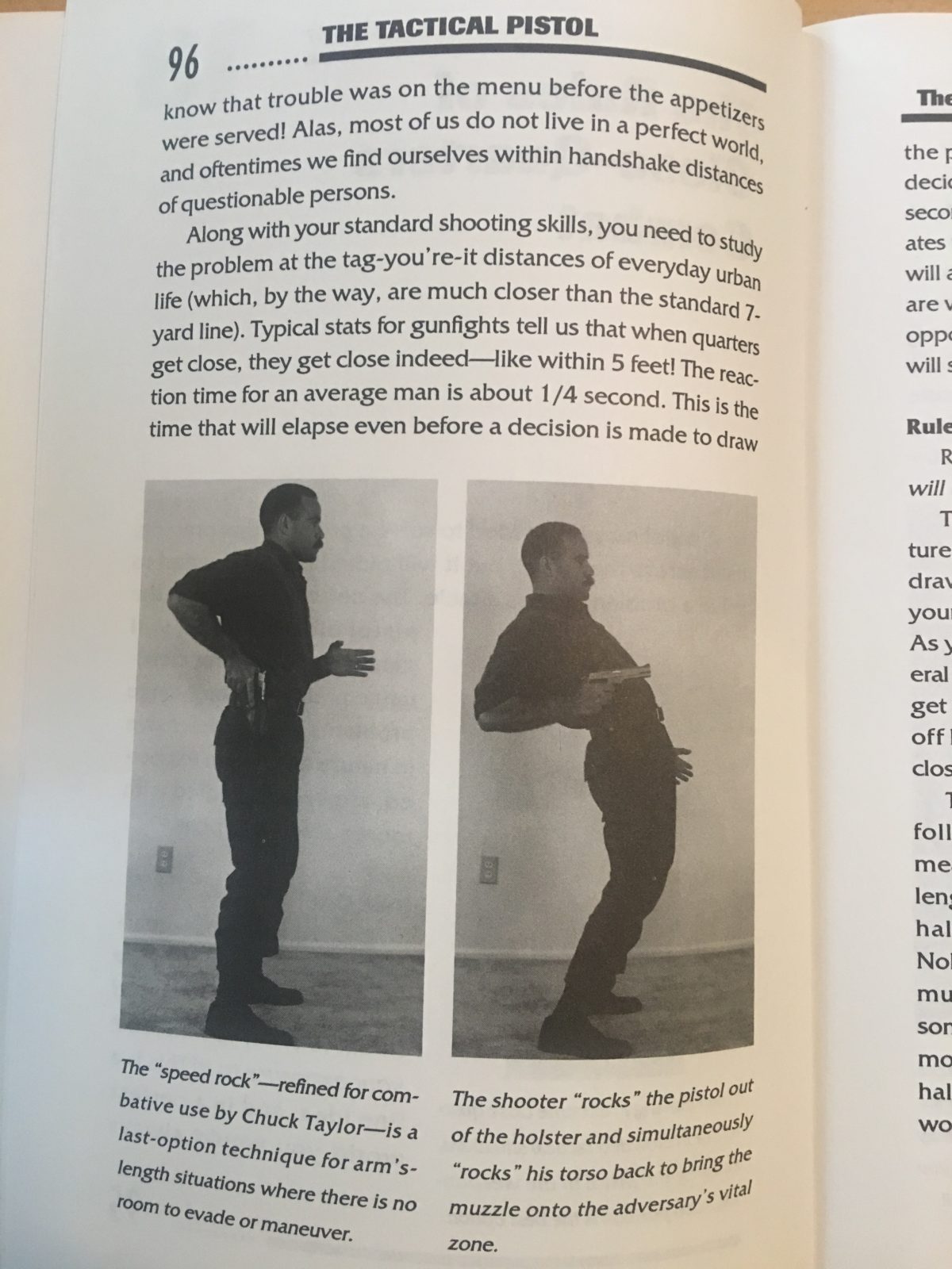 From The Tactical Pistol 1996 “The “speed rock” refined for combative use by Chuck Taylor is a last-option technique for arm’s length situation where there is no room to evade or maneuver. The shooter “rocks” the pistol out of the holster and simultaneously “rocks” his torso back to bring the muzzle onto the adversary’s vital zone”